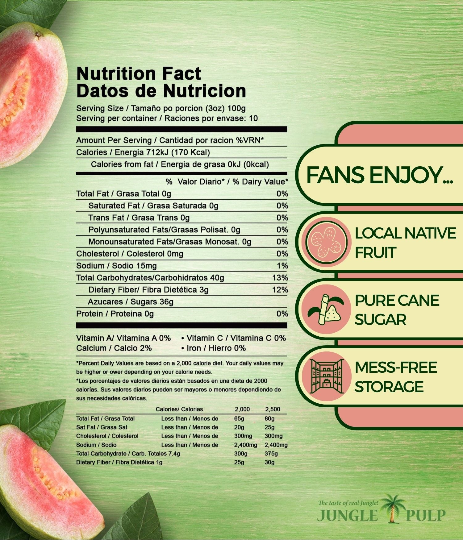 Ingredients: pink guava pulp, cane sugar, water, guar gum as gelling agent, sodium erythorbate at 0.3% as antioxidant, sodium benzoate and potassium sorbate at 0.05% as preservatives.